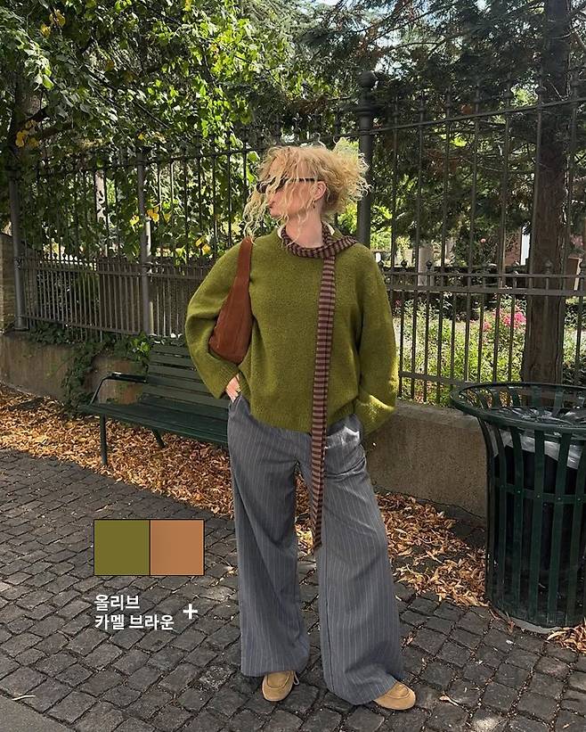 올리브 니트에 브라운백을 메고