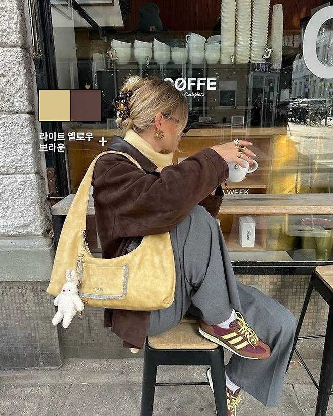브라운 자켓 안에 라이트 옐로우 아이템을 받쳐 입으면 얼굴 주변이 환해지면서
