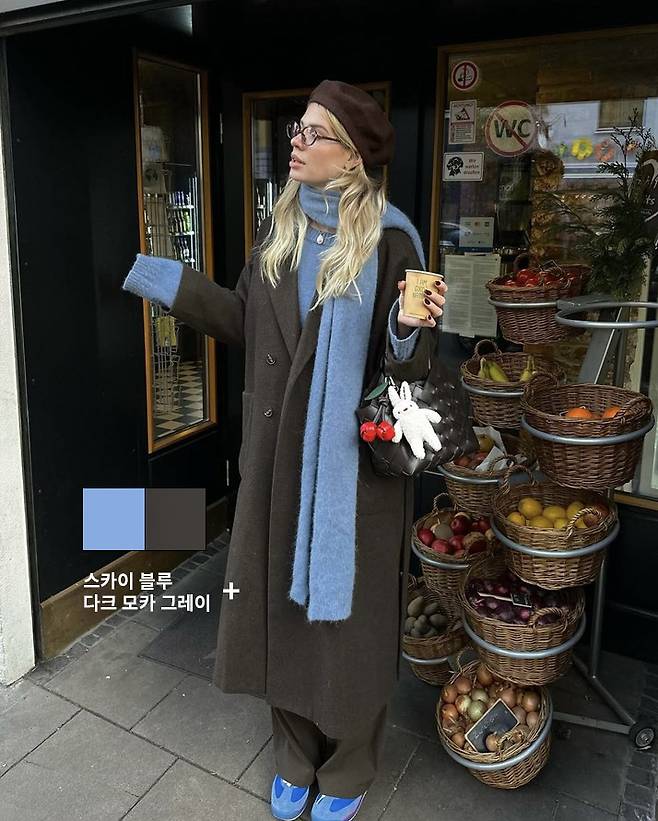 다크 모카 그레이에 스카이블루 니트를 받쳐 입고, 스카이 블루 머플러를 매치하면 차분하면서도 세련된 무드가 완성돼요.
