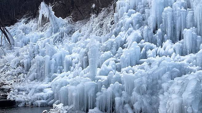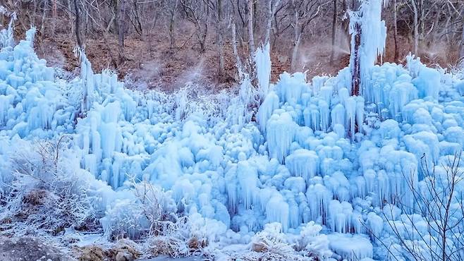 지금 비슬산에 가야 하는 가장 큰 이유는 바로 '얼음동산'입니다! 계곡물을 끌어올려 인공적으로 조성한 거대한 빙벽은 혹한의 날씨 속에서 더욱 투명하고 견고하게 얼어붙어 장관을 이룹니다.
