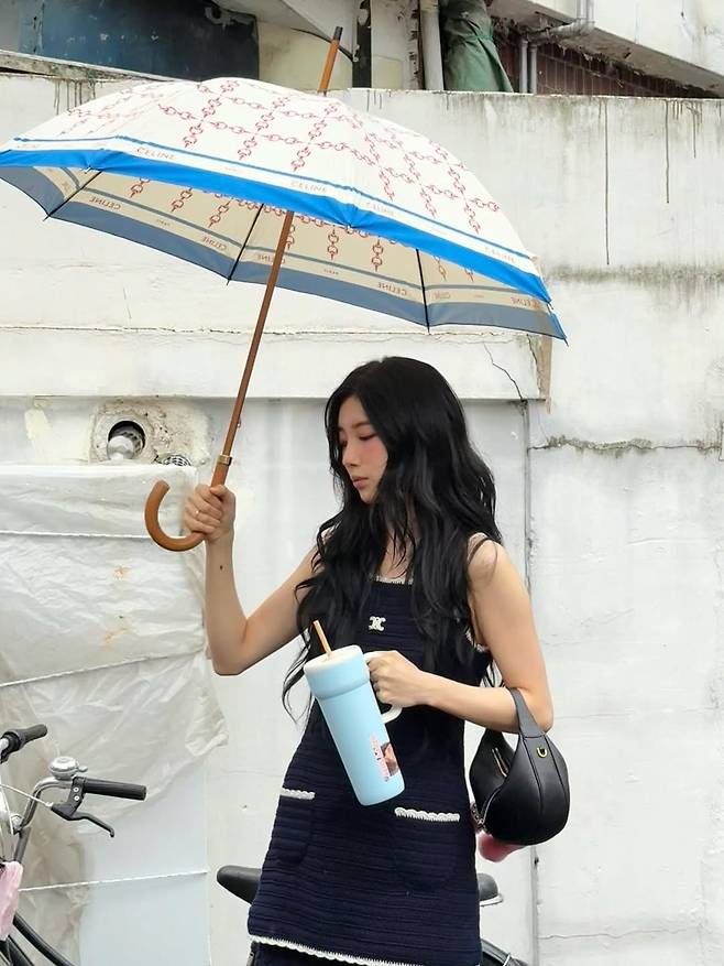 별다른 설명 없이 올라온 사진 속 수지는 네이비 니트 원피스에 무릎 아래까지 오는 블랙 부츠, 크로스백과 우산을 매치해 비 오는 날의 실용적인 여름 룩을 완성했다.