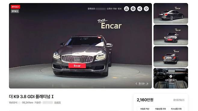 실제로 중고차 플랫폼 엔카닷컴에 따르면, 2019년형 K9 3.8 플래티넘 트림은 주행거리 10만km 미만, 무사고 조건에서 2,160만 원에 판매되고 있다.