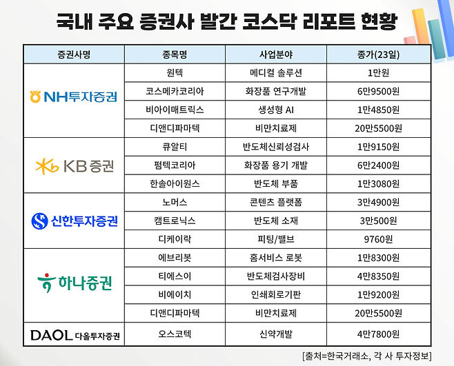 바이오주 외에도 국내 증권가에서는 이재명 대통령의 코스닥 시장 정상화 발언 이후 코스닥 종목 관련 분석 리포트가 잇따라 쏟아지고 있다. 10일 이후 이날(23일)까지 NH투자증권은 ▲원텍 ▲코스메카코리아 ▲비아이매트릭스, KB증권은 ▲큐알티 ▲펌텍코리아 ▲한솔아이원스 등의 보고서를 발표했다. 신한투자증권은 ▲노머스 ▲켐트로닉스 ▲디케이락, 하나증권은 ▲에브리봇 ▲KX ▲티에스이 ▲비에이치 등 다양한 종목을 대상으로 리포트를 연이어 내놨다.