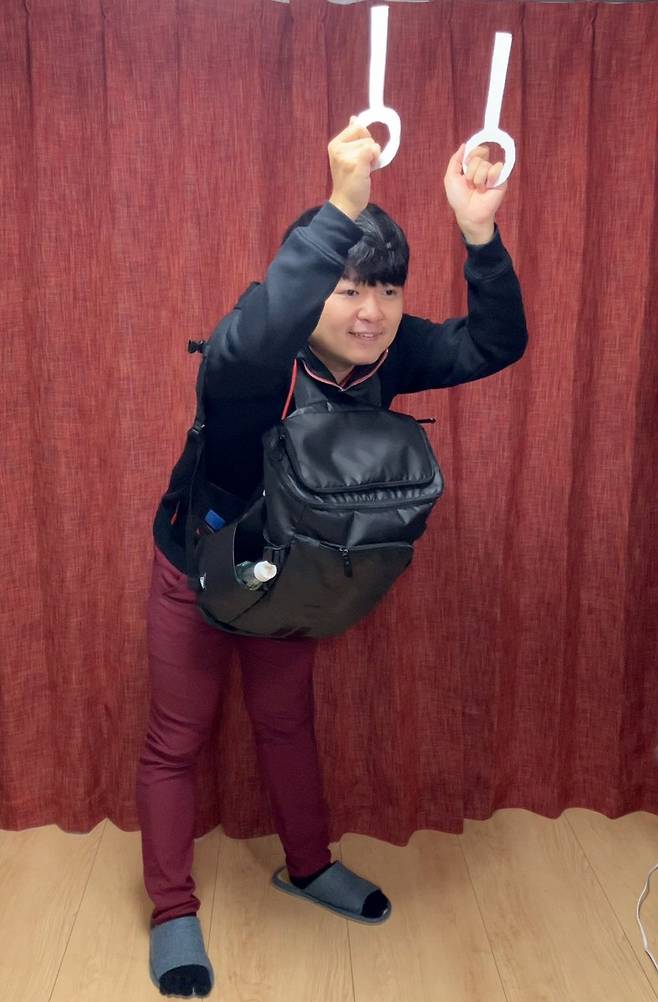붐비는 전철 안 앉아있는 친구와 이야기하는 친구