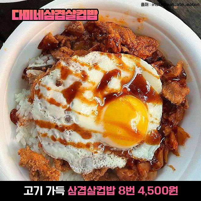 다미네컵밥은 6호점에 있어요. 1번 모둠컵밥부터 8번 삼겹살컵밥까지 번호별로 다양한 컵밥을 먹을 수 있는데요. 가장 인기가 많은 건 모둠컵밥과 삼겹살 컵밥!