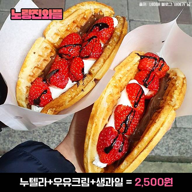 노량진 와플은 3호점에 자리 잡고 있어요. 와플은 원하는 대로 주문하는 커스텀 와플이에요. 우유 생크림, 사과잼, 아이스크림, 생과일, 초코칩 등 다양한 재료를 조합해서 먹을 수 있어요.