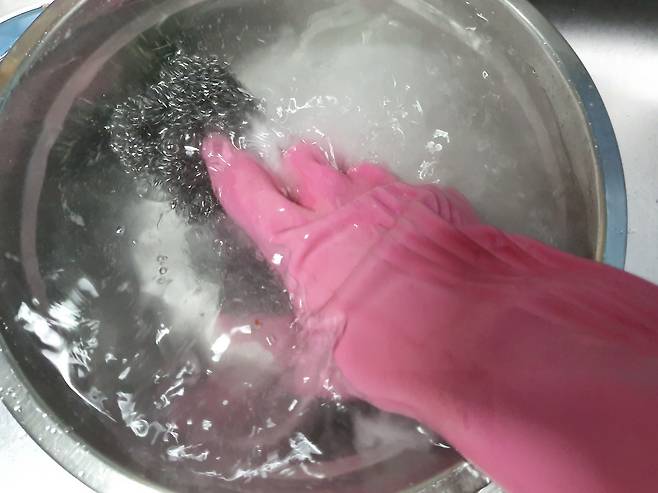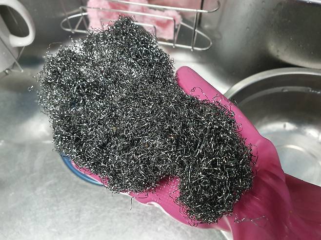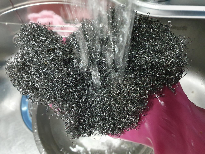 철 수세미를 잡고