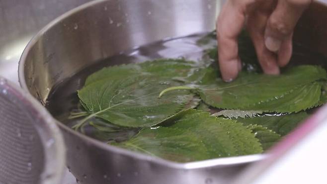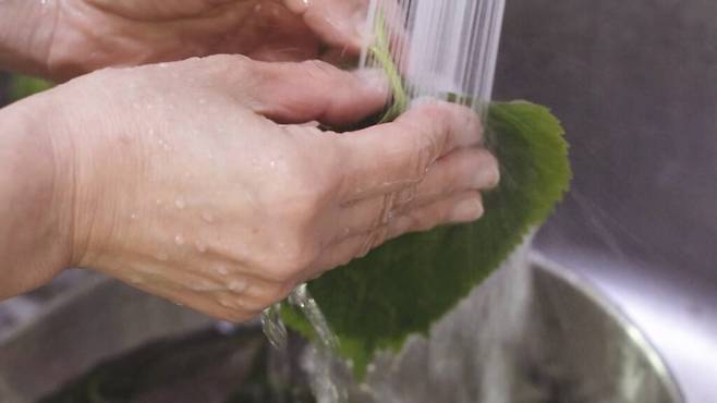 물에 식초를 조금 넣어 깻잎을 5분 정도 담그면 농약과 세균, 벌레까지 제거돼 더 깨끗하게 먹을 수 있습니다. 5분 후 흐르는 물에 깨끗 2번 씻으세요. 물기가 완전히 없도록 탈탈 털어 주세요.
