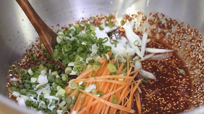 준비한 야채를 넣고 다시 섞어 주세요. 5분간 숙성시키면 양념이 어우러져 더욱 맛있어져요.