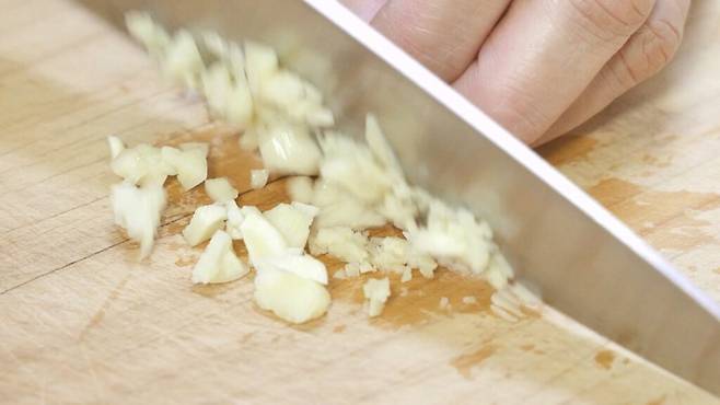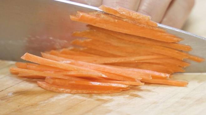 마늘 3알은 바로 다져 사용합니다. 실파 3 뿌리는 화면과 같이 송송 썰어 주세요. 당근 조금을 채 썰어 준비하세요. 작은 양파 반 개도 채 썰어 주세요.