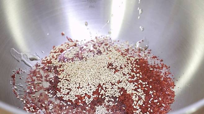 양푼에 해당 재료를 모두 넣어 주세요. 그리고 잘 섞어 줍니다. (매실청 1T, 설탕 2/3T, 고춧가루 2T, 청주 1T, 간장 4T, 마늘, 깨 1T, 멸치액젓 1T, 참치액젓 1+1/2T)