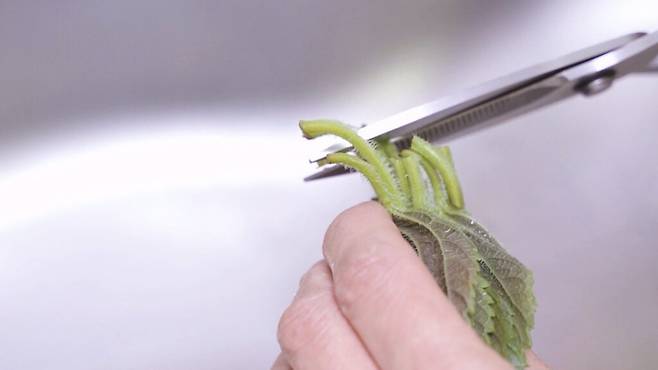 꼭지는 조금만 남긴 채 잘라 주세요. 그래야 한 장씩 집어서 먹기 편해요.