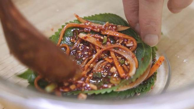 깻잎 2장을 넣고 숙성된 양념장을 발라 줍니다. 바로 먹어도 맛있고 반나절에서 하루 상온 숙성하면 양념이 더 잘 배어 맛이 훨씬 더 깊습니다. 이후 냉장 보관해서 드시면 맛있어요.