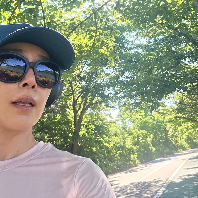 공개된 사진 속 그는 연핑크 스포츠웨어에 블랙 캡과 빅사이즈 선글라스를 매치해 운동복마저 스타일리시하게 소화했다.