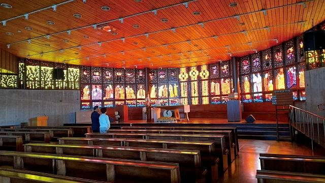 소나무 숲이 우거진 십자가의 길까지 한 바퀴 둘러본 후 천주교 복합예술공간인 ‘기억과 희망’ 안에 자리한 대성당으로 향해볼 차례입니다. 2021년 김대건 신부 탄생 200주년을 맞아 개관한 공간입니다. 대성당은 장미꽃잎을 형상화했습니다. 대성전 입구에 자리 잡은 커다란 석문은 프란치스코 교황 방문 당시 축복한 돌을 옮겨 문으로 삼아 의미를 살렸습니다. 500명이 미사를 볼 수 있는 성당 내부로 들어서면 신비로운 빛을 뿜어내는 압도적인 스테인드글라스와 마주합니다. 성당 한쪽엔 지난해 새롭게 조성한 ‘김대건 신부 집안 기념관’도 있습니다. 김대건 신부 가문에서 순교한 이들의 이름이 조명과 함께 은은하게 빛납니다. 비치된 QR코드를 찍으면 스마트폰으로 해설을 들을 수 있습니다. 바로 옆에선 솔뫼성지 성역화 사업에 관한 100년 역사도 한눈에 훑어볼 수 있습니다. 맞은편에 있는 ‘이춘만 미술관’에선 가톨릭 미술 작품을 전시하고 있습니다.