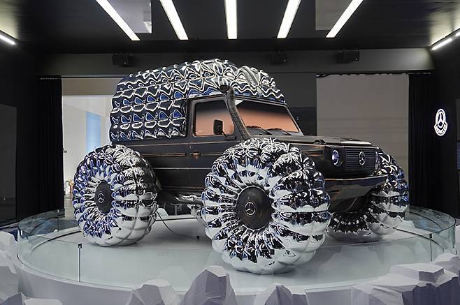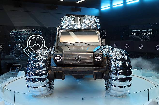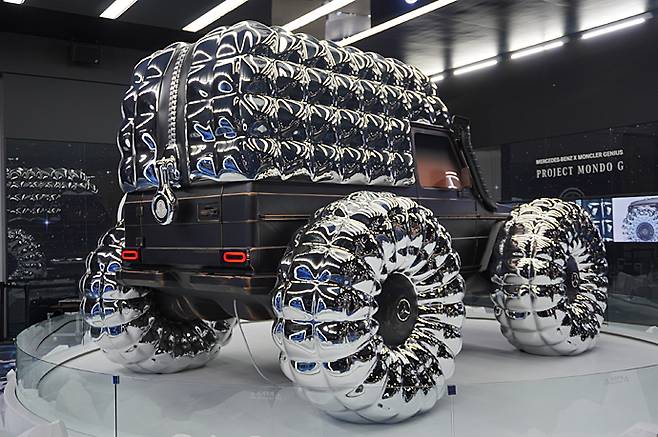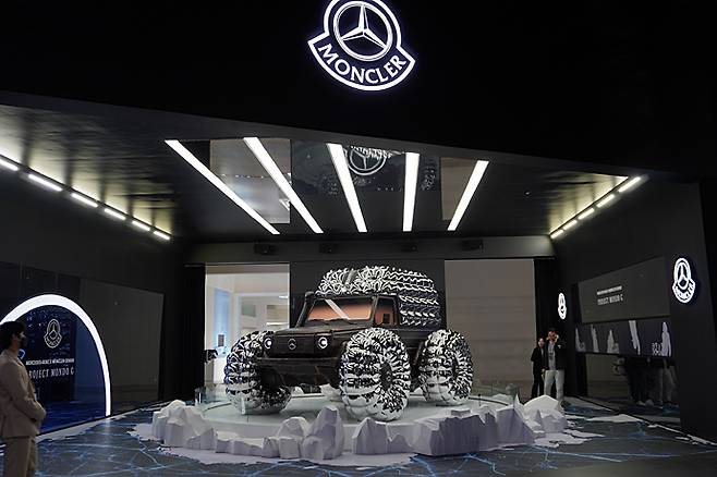 특히 이번에는 럭셔리 아웃도어 브랜드인 몽클레르와의 협업을 통해 완성된 프로젝트 몬도 G가 전시되어 눈길을 끌었다. 프로젝트 몬도 G는 몽클레르가 처음으로 자동차 기업과 진행한 파트너십으로, 메르세데스-벤츠 G-클래스를 기반으로 몽클레르 고유의 패딩 재킷 스타일을 결합했다. G-클래스의 각진 디자인과 몽클레르 특유의 퀼팅 직물의 부드러운 곡선이 어우러진 모습, 거친 색감의 차체와 매끈하고 반짝이는 패딩 소재가 강렬한 대비를 보여주었다.