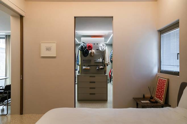 바로 드레스룸입니다. 요긴 문을 닫을 수 있어요. 문을 닫으면 깔끔하게 미술 작품들 속에 침대만 포근히 놓여져 있어요. 개인적으로 물건들이 밖에 나와 있고 눈에 보이는 걸 별로 안 좋아해서 그런지 속속 잘 숨어 들어간 공간들이 아주 좋더라구요~