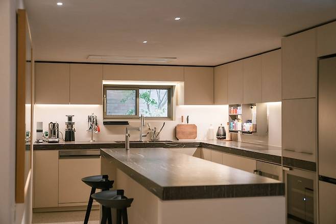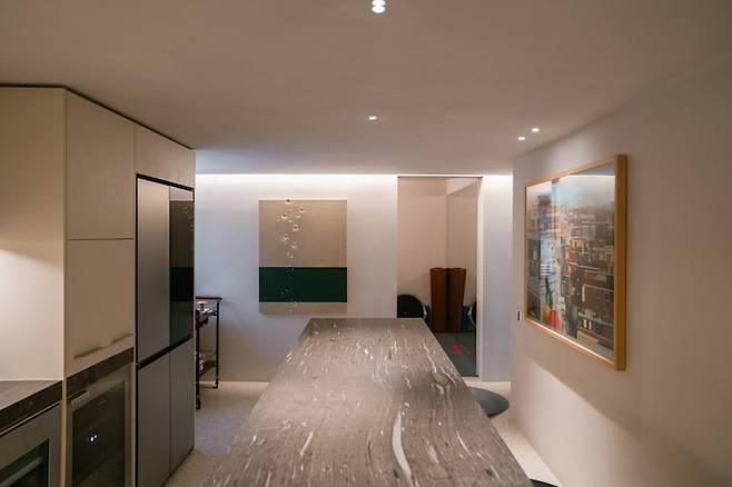 다이닝룸을 지나면 오른편엔 서브룸, 왼편엔 주방이 있습니다. 먼저 주방부터 소개해 드리자면 쭉 뻗은 주방과 벽에 걸린 큰 그림이 아주 잘 어울리는 아주 시원시원한 공간이었어요.