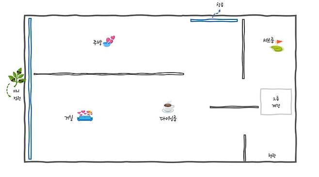 부족한 실력으로 도면을 슥슥 그려 보았습니다. 구체적인 공간은 아래 이미지 첨부해 두었으니 도면으로는 대략적인 구조만 참고해 주세요!🙏