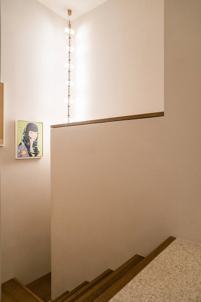이번에도 역!시!나! 2층으로 올라가는 계단 벽면에도 미술 작품이 걸려 있는데 조명과 아주 찰떡이더라구요.