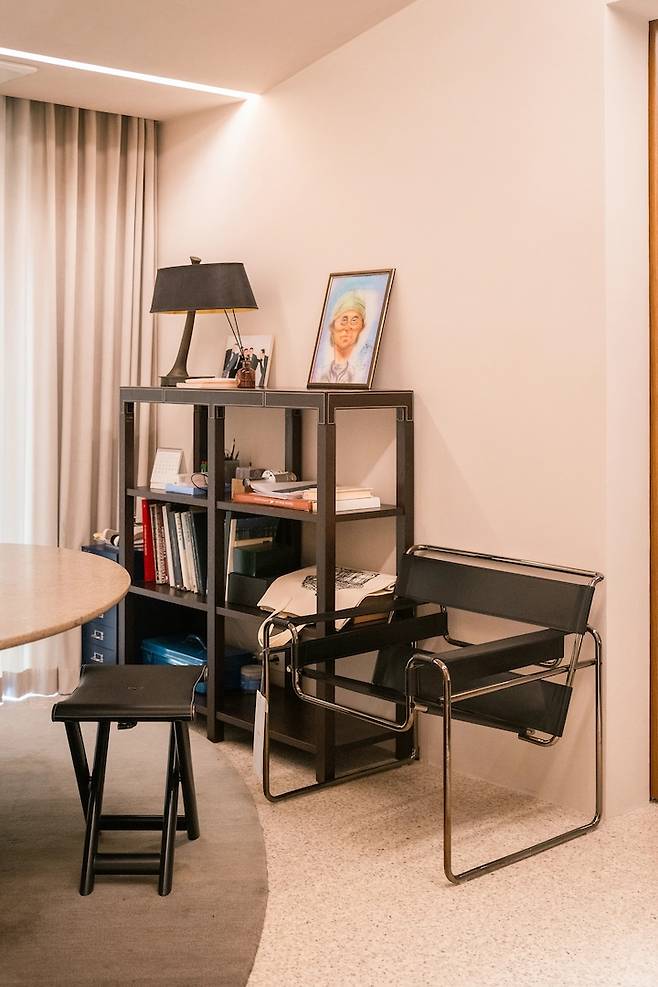 그림 작품을 비롯한 전체적인 색감이 잘 어우러져서 앉아 있으면 편집숍에 있는 거 같았어요. 우디한 톤과 블랙의 조합! 의자가 모두 다른 디자인이었는데 전 이게 그렇게 예쁘더라구요.