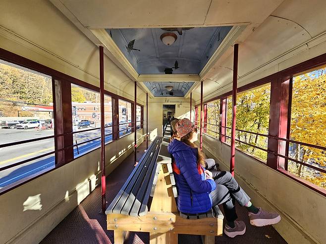 막상 타 보니 편도 선로를 왕복하는 관광 코스였다. 기차가 산맥과 자전거 길을 따라 움직였다. 지루해질 즈음이 되니 다행히 내리라고 한다. 내 발이 아닌 기차로 등산을 했던 것. 그래도 미국에서 기차는 비싸고 시간도 오래 걸려 흔히 이용하지 않는 수단인데, 이렇게 잠시나마 단풍 구경을 하며 기차 여행을 할 수 있어 즐거웠다.