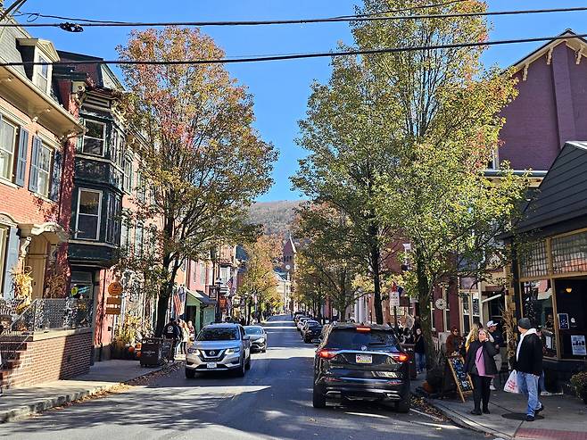 그래서 지난가을, 다시 짐 소프를 다녀왔다. 오로지 기차를 타고 단풍을 보기 위해! 여전히 많은 관광객으로 북적여서 도시 전체에 활기가 넘쳤다. 상점과 집 사이사이로 보이는 포토노 산맥 줄기와 단풍으로 물든 숲이 어우러져 그림엽서 속 풍경을 현실화하고 있었다. 이윽고 짐 소프는 몇 번을 와도 지루하지 않은 곳이 되었고, 애정하게 되어버린 지 이제 3년 차다.
