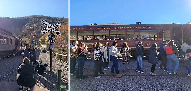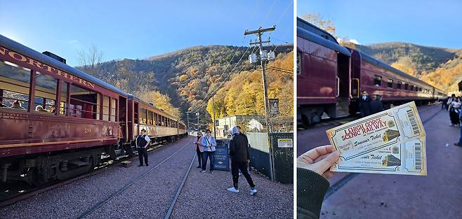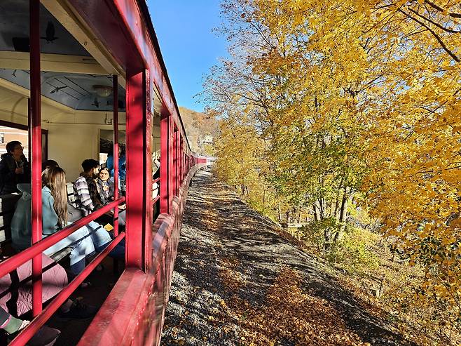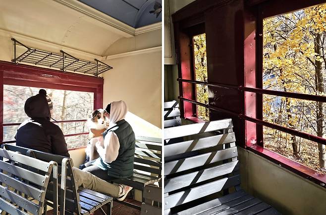 막상 타 보니 편도 선로를 왕복하는 관광 코스였다. 기차가 산맥과 자전거 길을 따라 움직였다. 지루해질 즈음이 되니 다행히 내리라고 한다. 내 발이 아닌 기차로 등산을 했던 것. 그래도 미국에서 기차는 비싸고 시간도 오래 걸려 흔히 이용하지 않는 수단인데, 이렇게 잠시나마 단풍 구경을 하며 기차 여행을 할 수 있어 즐거웠다.