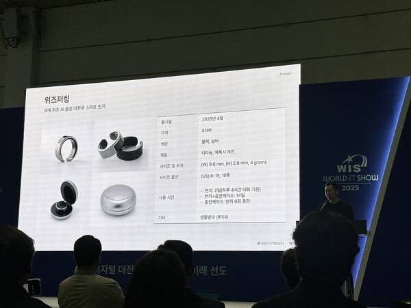 주식회사 브이터치 김석중 대표가 2부의 첫 발표자로 나서 AI와 음성으로 대화가 가능한 음성인식 반지 ‘위즈퍼링’을 소개했다.
