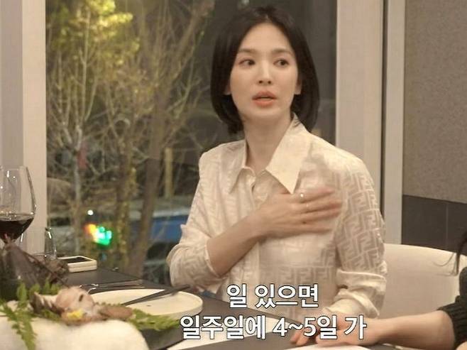 송혜교는 배우 전여빈, 가수 강민경과 저녁식사를 하던 중 전여빈이 "촬영 때보다 더 야위었다"라고 말하자 "운동을 쉬지 않는다. 자이로토닉도 진짜 열심히 했다"라고 밝혔습니다.