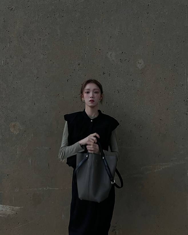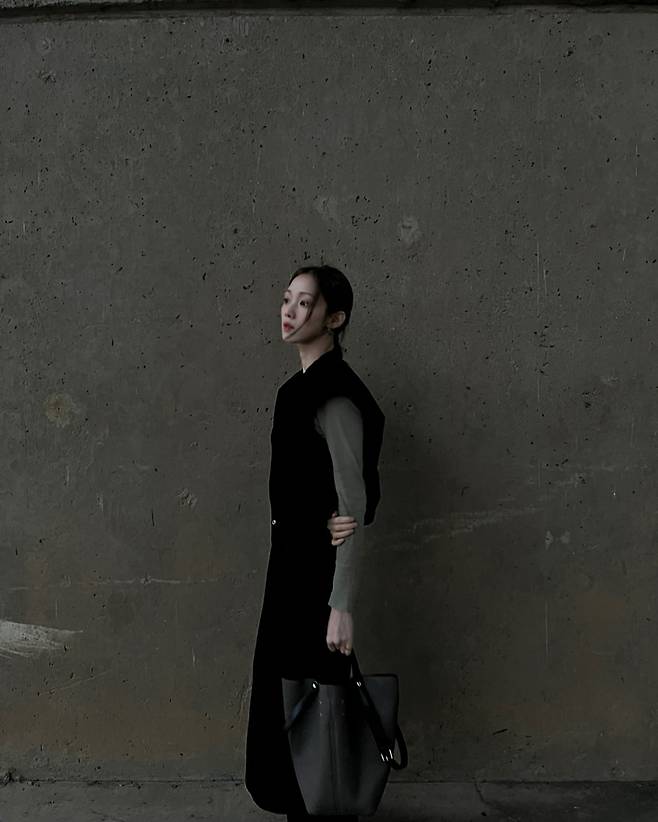 이성경이 선택한 이번 룩은 어두운 톤의 레이어링과 미니멀한 실루엣이 돋보이는 스트릿 시크 스타일이에요.