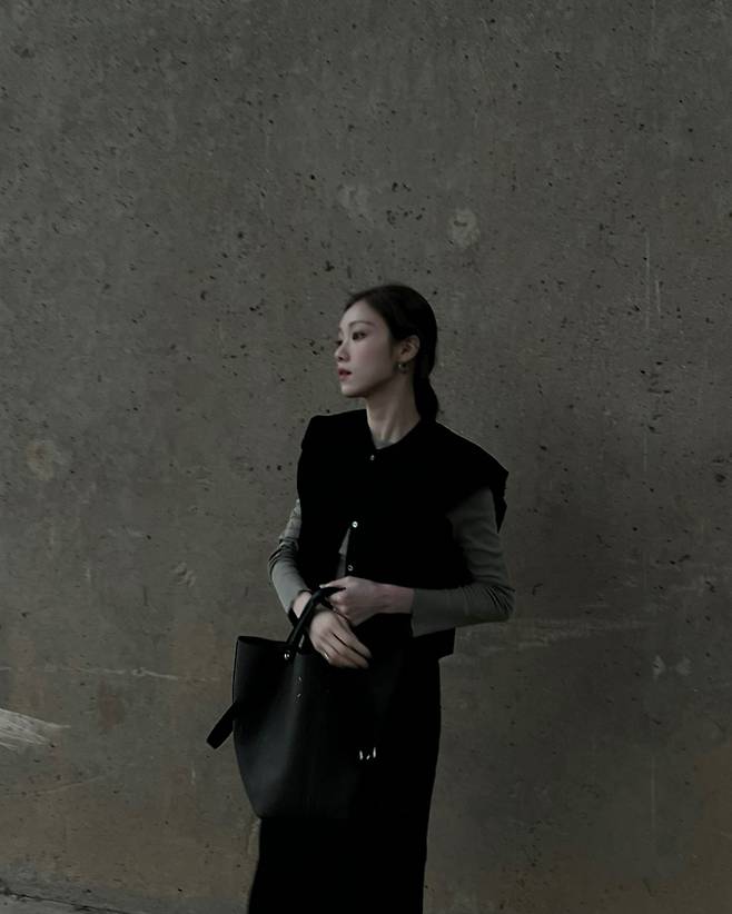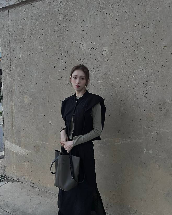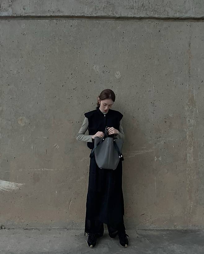 기본적인 카키 컬러의 슬림한 이너에 블랙 민소매 셔츠 원피스를 레이어드하고, 여기에 베스트처럼 연출한 같은 소재의 아우터가 묵직한 분위기를 더해줘요.