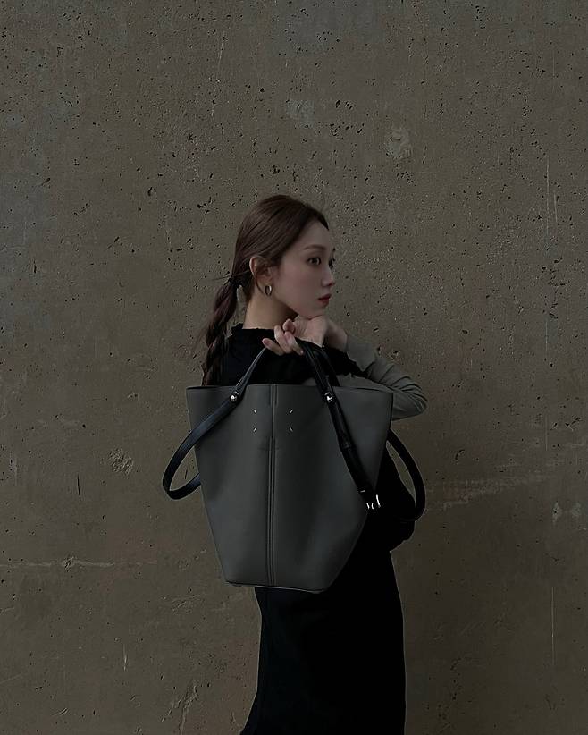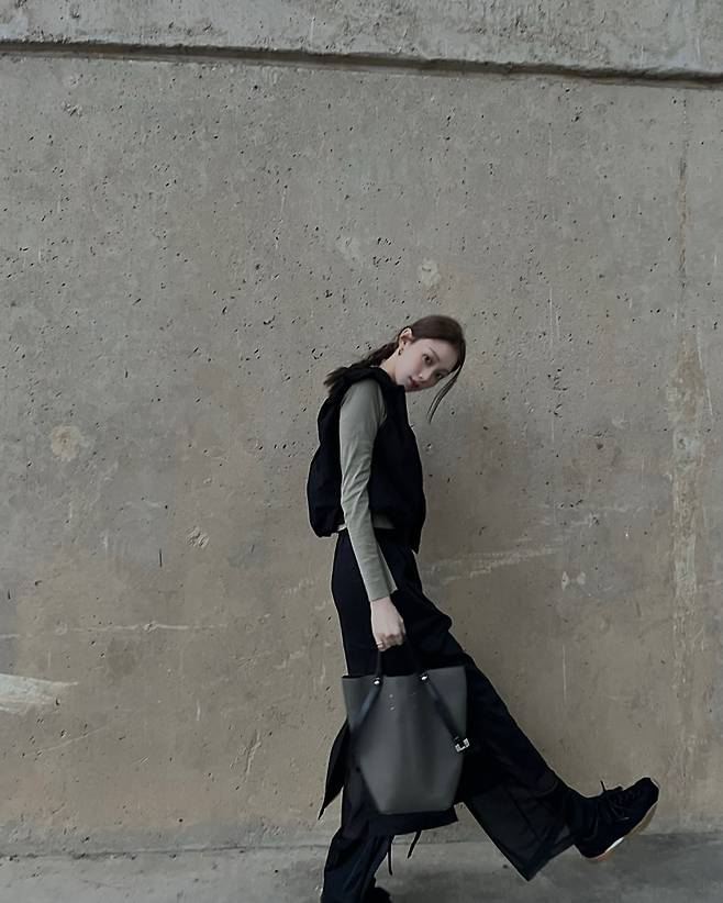무채색 계열의 조합이지만 소재의 질감이나 기장 차이로 리듬을 만들었고, 블랙 스니커즈와 톤을 맞춘 회색 토트백이 룩에 단단함을 더해줘요.