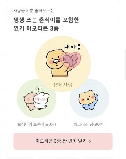 카카오는 이날부터 모든 이용자에게 이모티콘 3종을 제공하기 시작했습니다. 모든 이용자가 대상입니다. 작년 10월 서비스 장애로 피해를 겪었다고 신고했든 하지 않았든 누구나 받을 수 있다는 얘기입니다. 한 종류는 카카오톡을 쓰는 한 계속 사용할 수 있고, 나머지는 다운로드 후 90일간 쓸 수 있습니다.