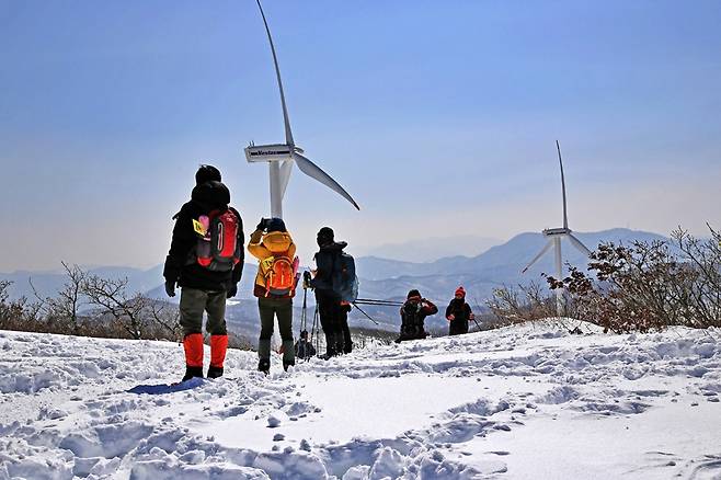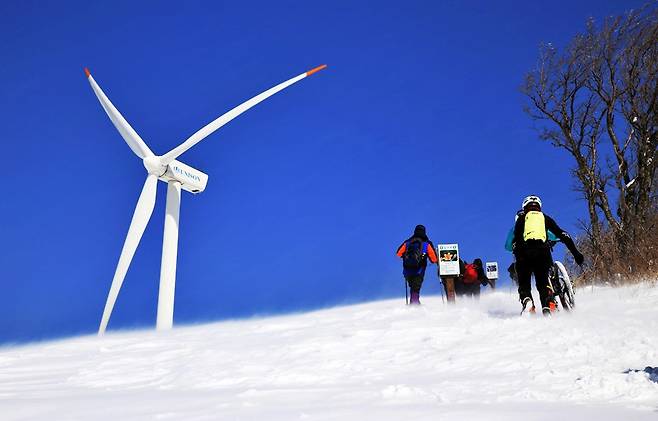 선자령 능선 위에는 수십 기의 풍력발전기가 줄지어 서 있다. 드넓은 초원, 바람에 돌아가는 거대한 풍차, 새하얀 눈이 합쳐지며 국내에서 보기 어려운 이국적인 풍경이 완성된다. 겨울철 방문객들이 가장 인상 깊었다고 꼽는 포인트이기도 하다.