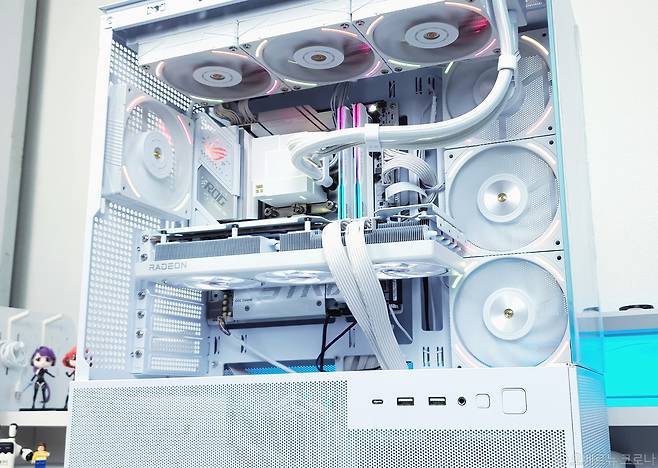 마지막으로, 전체 테스트 내용을 토대로 컴퓨터 온도를 살펴봤는데요. 3열 일체형 수냉쿨러를 CPU 쿨러로 사용했을 때, 소프트웨어를 통해 측정된 값은 최대 63도를 기록했고, 전원부 온도는 44도로, 리뷰에 사용된 인텔 225F는 물론, 고사양의 프로세서도 안정적으로 받쳐줄 수 있는 강력한 전원부 냉각 성능을 확인할 수 있었습니다. 프로세서에 따라, 냉각 장치를 효율적으로 구성하여, CPU 온도와 컴퓨터 소음, 최적의 성능이라는 균형 잡힌 퍼포먼스를 이끌어 낼 수 있는 것을 알 수 있고, 이를 통해, 더욱 조용한 게이밍 컴퓨터나 안정적인 AI 작업용 컴퓨터 조립도 가능하겠습니다.