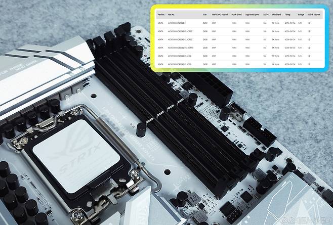 램 메모리의 경우, DDR5 슬롯 4개를 사용하고 있으며, XMP와 AEMP III 메모리 프로파일 설정으로 최대 9,066(O.C) MT/s 메모리 모듈과 256GB의 넉넉한 메모리 구성을 지원합니다. QVL 리스트를 보면, 대다수의 제조사 램 메모리가 8,000 이상의 속도에서 안정적으로 동작하고 있음을 확인할 수 있고, 이를 바탕으로 더욱 안정적인 램오버가 가능해, 더욱 손쉽게 컴퓨터 성능을 향상시킬 수 있고요.