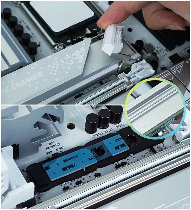 PCIe 5.0x4 인터페이스를 지원하는 M.2_1 슬롯에는 두꺼운 SSD 방열판, PCIe 4.0 인터페이스를 지원하는 3개의 M.2 슬롯에는 풀커버 형태의 방열판을 사용해, M2 NVMe SSD를 최적의 온도로 유지하여 안정적인 성능을 보장하죠.