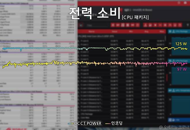 이를 바탕으로, 인텔과 ASUS 권장값을 비교해 보면, 각각의 테스트에서 약 9% 이상의 체감 가능한 코어 성능 차이를 확인할 수 있었는데요. 인텔 코어 울트라5 프로세서 225F의 프로세서 기반 성능은 65W, 최대 터보 성능은 121W로 설정되어 있으며, 약 30분간 OCCT 전원 테스트를 통해 풀로드 테스트를 진행해 보면, 최대 터보 성능을 안정적으로 이끌어내는 모습을 확인할 수 있습니다.