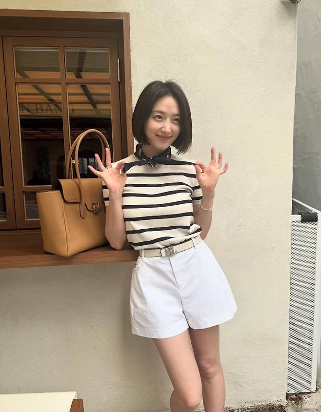 이번 코디는 스트라이프 니트와 화이트 쇼츠, 그리고 폴로 랄프로렌 신상 가방의 조합으로 완성됐다.