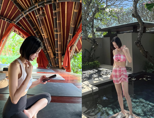 요가 수업에선 브라톱과 레깅스 차림으로 탄탄한 바디라인을 뽐냈고, 이어지는 풀사이드 컷에서는 핑크 체크 패턴의 비키니를 입고 자연스러운 매력을 발산했다.