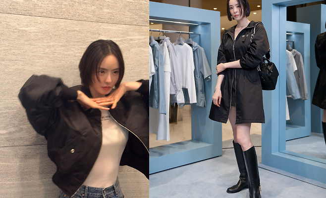 이다희가 블랙 코트 드레스와 롱부츠로 세련된 가을 패션을 선보이고 있다. 미니멀한 디자인의 블랙 코트는 심플하면서도 고급스러운 분위기를 자아내고 있으며, 무릎 위까지 오는 롱부츠는 다리 라인을 돋보이게 하면서 전체적인 룩의 균형을 맞추고 있다. 블랙 숄더백을 매치하여 도시적이고 세련된 스타일을 완성하고 있다.