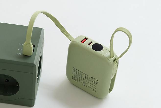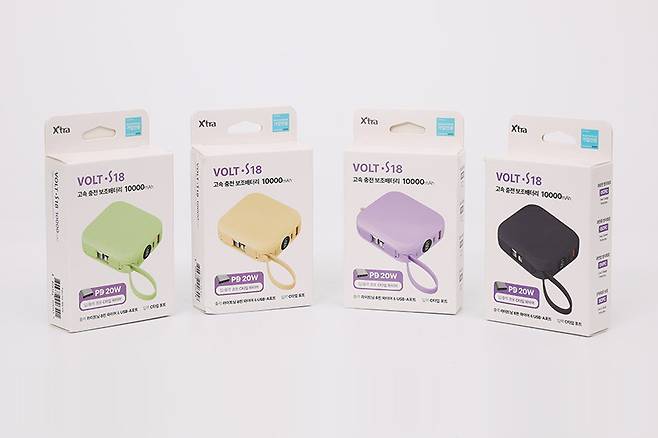 엑스트라 볼트 S18 보조배터리 10,000mAh는 자그마한 흰색 상자에 담겨 있다. 색상은 애시블루, 페일라임, 페일라벤더, 페일옐로 등 네 가지로 출시되었는데, 박스에 각각의 색상 제품이 인쇄되어 있다.