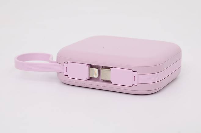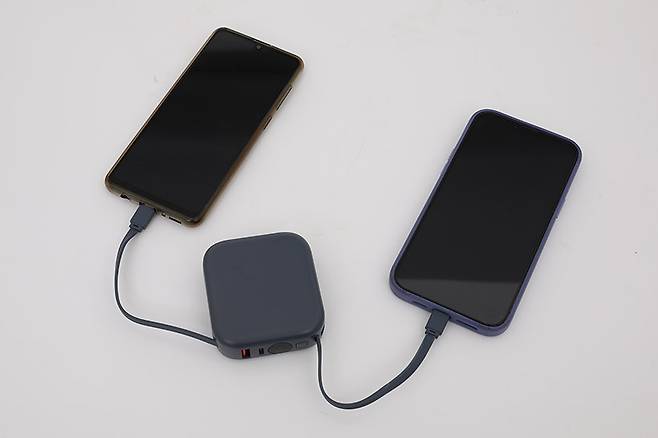 내장된 두 개의 케이블을 이용해 USB C타입 포트의 스마트 기기와 라이트닝 포트 스마트폰을 동시에 충전할 수도 있다.