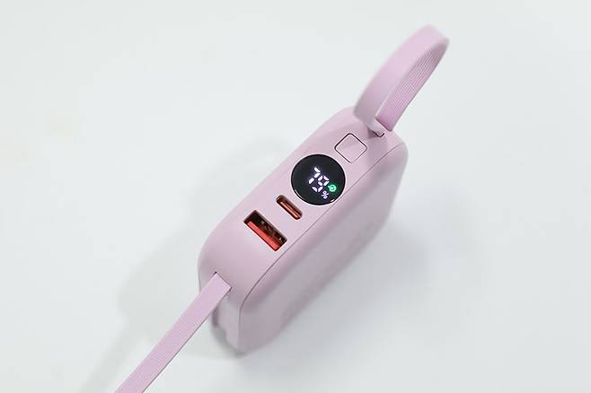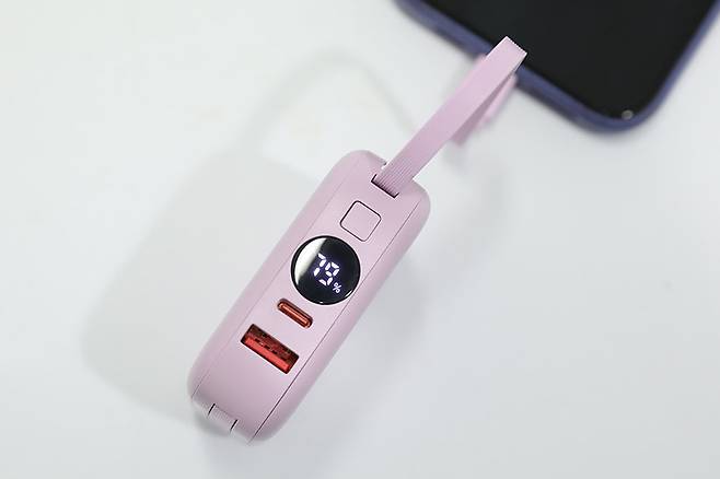 빌트인 C타입 케이블은 입력뿐만 아니라 출력 시에도 최대 20W까지 지원되기 때문에 USB PD 고속 충전을 지원하는 스마트 기기를 충전할 때에는 디스플레이에 녹색의 고속 충전 표시가 함께 나타난다.