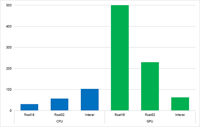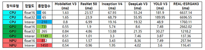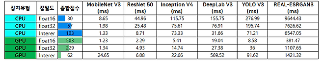 CPU 환경에서는 Integer 정밀도가 가장 양호한 성능을 보였다. 종합 점수 103점을 기록하며, MobileNet V3(1.33ms), ResNet 50(8.71ms) 등 중소형 모델에서는 효율적인 처리가 가능했다. 하지만 복잡한 모델에서는 REAL-ESRGAN이 6547.05ms, YOLO V3가 71.21ms로 시간이 오래 걸려, 한계가 명확히 드러났다. CPU Float32는 종합 점수 57점으로 전반적으로 안정적인 수준의 성능을 보였지만, Inception V4(75.61ms), DeepLab V3(76.91ms), REAL-ESRGAN(7626.62ms)에서는 성능 저하가 뚜렷했다. 반면 CPU Float16은 모든 항목에서 가장 낮은 성능(총점 30점)을 기록하며, 추론 속도는 MobileNet V3에서도 8.65ms로 낮지 않았고, REAL-ESRGAN의 경우 9644.43ms로 매우 느려 AI 연산용으로는 부적합했다.