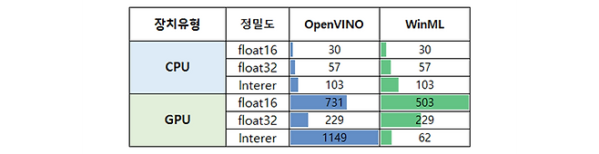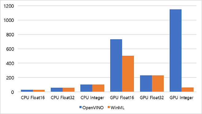 OpenVINO는 전반적으로 높은 성능을 보여주며, 특히 GPU Integer와 GPU Float16에서 큰 차이를 기록했다. 반면,WinML은 CPU 환경에서는 비슷한 수준이나, GPU Integer에서 점수가 급격히 낮아지는 모습을 보인다.