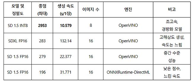 동일한 모델이지만 OpenVINO 대신 ONNXRuntime 엔진을 사용할 경우, 총점은 196점으로 떨어졌고 생성 시간도 31.771초로 더 느렸다. 이처럼 같은 모델이라도 AI 엔진 선택에 따라 성능 차이가 크게 나타날 수 있음을 보여준다.