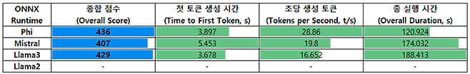 Llama3는 429점을 기록하며 뒤를 이었으며, 첫 토큰 생성 시간은 3.678초로 Phi보다 빠른 응답성을 보였다. 초당 생성 토큰 수는 16.652로 중상 수준이었고, 총 실행 시간은 188.413초로 다소 길었다. Mistral은 407점으로 Llama3와 유사한 성능군에 속하며, 초당 19.800 토큰을 생성했다. 단, 첫 토큰 생성 시간이 5.453초로 세 모델 중 가장 느린 응답 속도를 보였다. 한편, Llama2는 ONNXRuntime에서 점수 0점을 기록했고, 토큰 생성 시간 및 처리 속도도 측정되지 않았다.