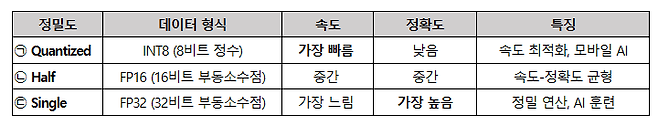 OpenVINO와 ONNX는 정밀도에 따라 다시 3가지로 나뉘는데 각 정밀도는 AI 모델의 성능, 연산 속도, 메모리 사용량 등에 영향을 미친다. AI의 추론 속도를 보기 위해서는 ㉠Quantized(INT8)를, AI 훈련 정확도를 보기 위해 ㉡Single(FP32) 또는 ㉢Half(FP16)를 테스트하는 것.